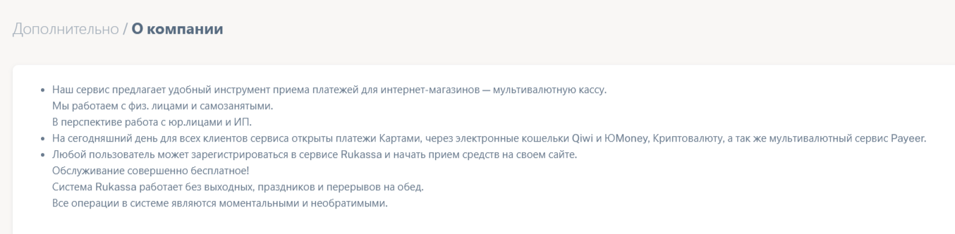 О стоимости услуг сайта rukassa pro можно узнать в разделе о компании. Здесь представлена информация о том, что платежный сервис обслуживает клиентов совершенно бесплатно. За деньги на сайте осуществляются перечисления средств. О комиссиях за перевод вам поведает раздел «Тарифы». О дополнительных сборах за индивидуальные опции пользователям расскажут менеджеры саппорта.