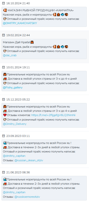 Среди популярных товаров была икра, морепродукты и другие подобные товары. Пользователям предлагали стандартные условия: доставку в любой уголок России, оптовые скидки и премиальное качество.