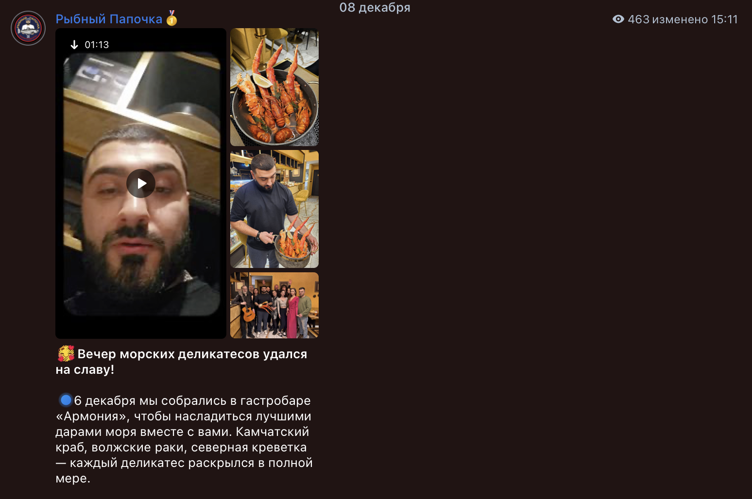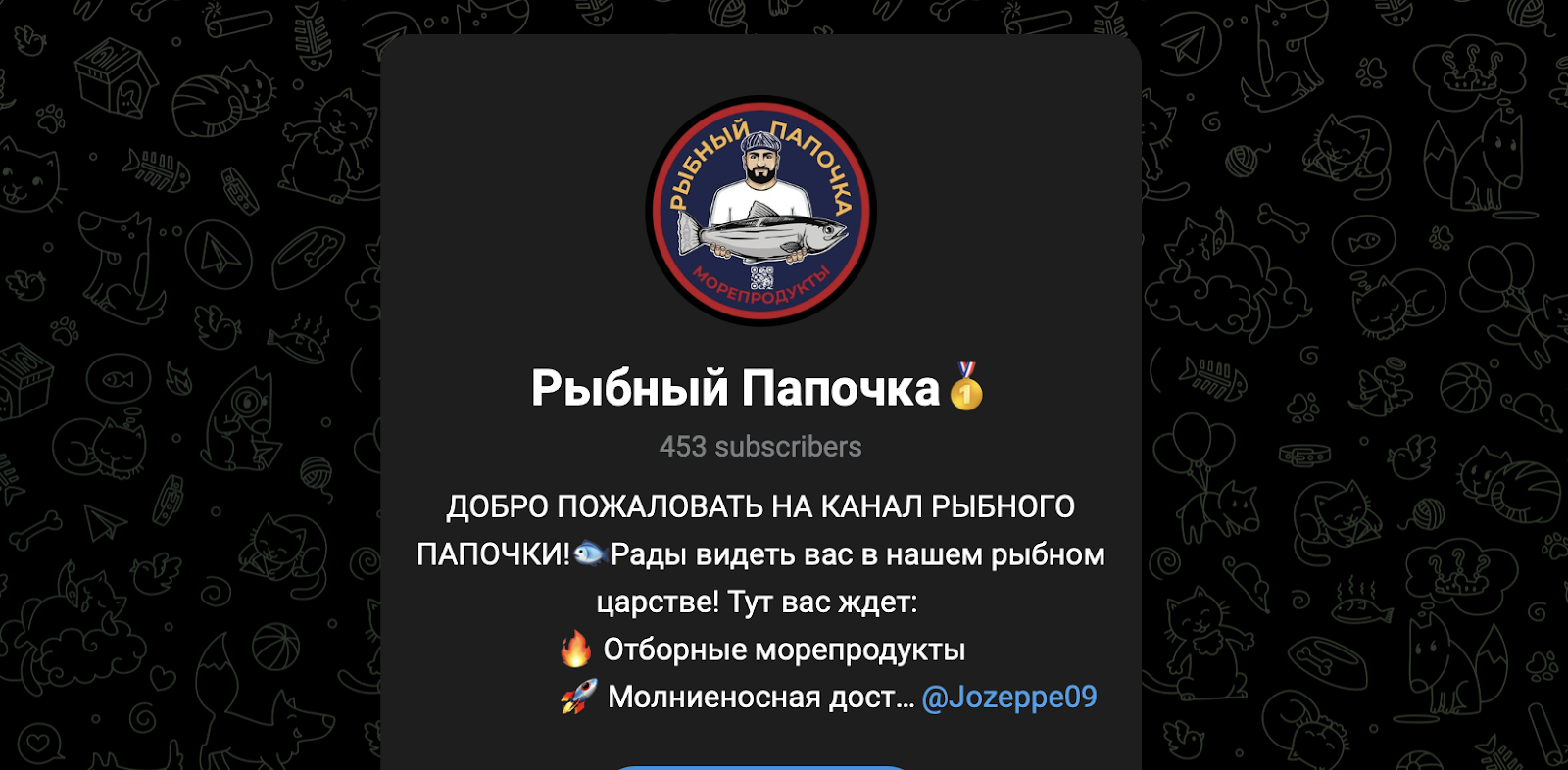 Основная площадка проекта — Telegram-канал Рыбный Папочка (fishdaddy1). Во главе проекта стоит некий Jozeppe09: кроме его никнейма в телеграм никаких сведений нет. В ленте регулярно публикуются аппетитные видео с продукцией, отзывы покупателей, в достоверности которых мы сомневаемся. Подписчиков на канале немного — менее 500 человек, что не особо соответствует статусу популярного магазина.