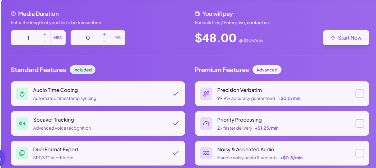 Базовая ставка транскрибации — 0,80 USD за минуту аудио. Стоимость рассчитывается автоматически исходя из длительности загруженного файла. Дополнительные премиальные опции: