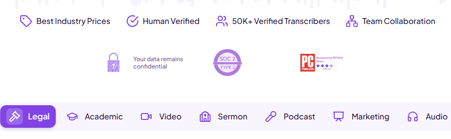 Система предлагает юридическую транскрибацию, обработку аудио, видео, академических материалов и маркетинговых записей.