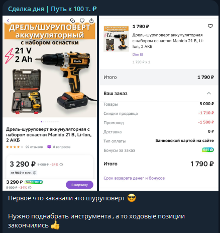 Авторы вели хронику операций. Постили несколько раз за день. Свежие промокоды, покупки, отчеты о продажах – все в открытом доступе. Главная категория – инструменты. Шуруповерты, болгарки, пилы, наборы ключей. Брали за 500–2000 рублей по промокодам. Продавали за 1500–3000. Чистая прибыль доходила до 900 рублей с единицы.