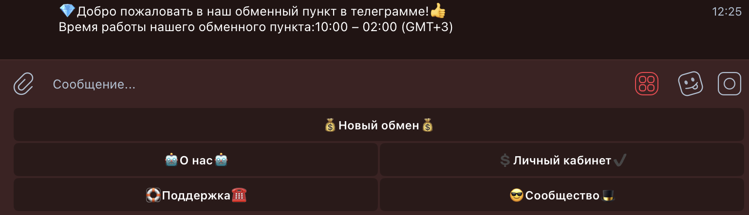 Другой важный источник сервиса в интернете — телеграм робот обменника Secret exbot. Он разработан для того, чтобы пользователь имел быстрый доступ к большей части функционала обменника. Чтобы воспользоваться ботом, нужно отправить запрос, после чего робот выдаст актуальные адреса для перевода криптовалюты. Также в меню есть краткое описание самого сервиса, контактные данные поддержки, простенький личный кабинет и ссылка на телеграм-канал. Заявленный режим работы обменника — с 10 утра до 2 часов ночи.