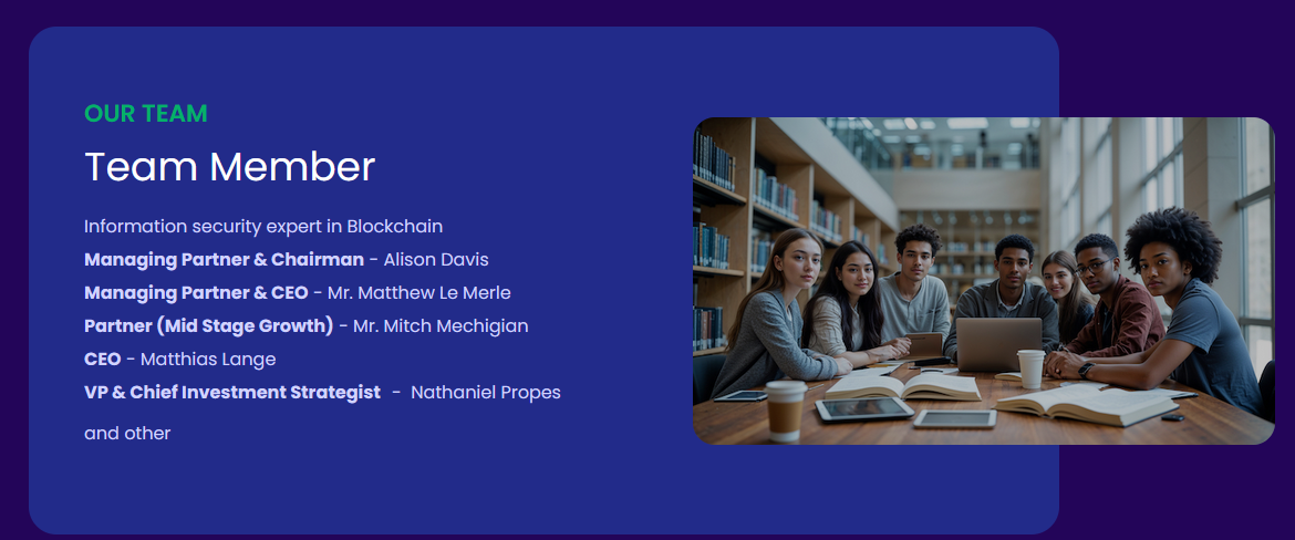 В разделе «Наша команда» есть имена и фотография. Первые даже реальные и у этих деятелей есть страницы на LinkedIn. Однако там никак не упоминается данный проект. А фото сотрудников сгенерировано нейросетью и не совпадает с ЛинкедИн.