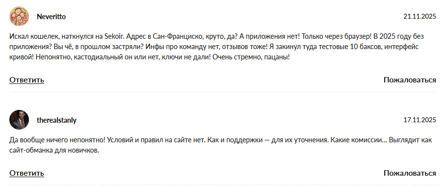 В своем текущем виде веб-ресурс работает недолго, но отзывы о Sekoir Com в интернете уже стали появляться. Все они негативные, люди пишут про некачественный сайт, отсутствие лицензий и так далее.