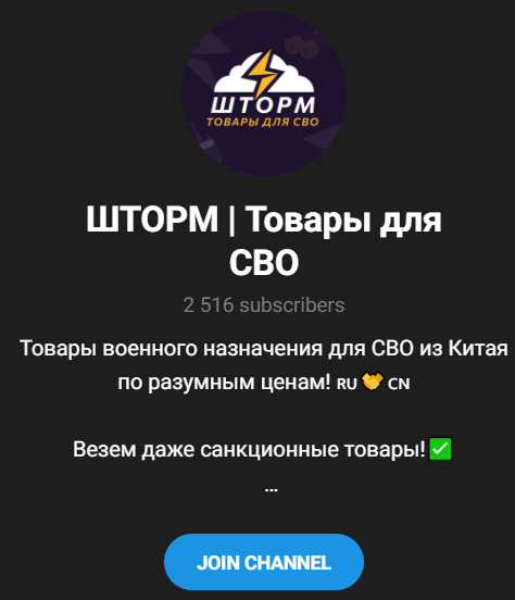 Канал появился в 2024 году, его создатели неизвестны. Магазин преподносят как возможность купить товары для фронта с большими скидками и с доставкой по всей России. Шторм Товары для СВО в последнее время активно рекламируется в Телеграмме.