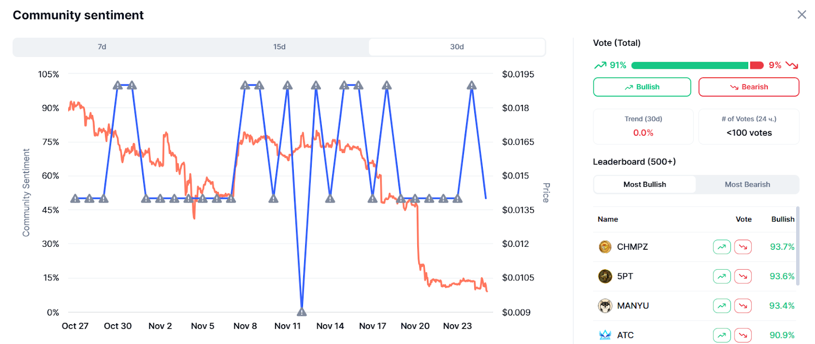 Судя по полоске Bullish/Bearish, на основе тысячи голосов пользователей, можно сделать вывод, что инвесторы верят в Silo. 91% проголосовали “за” и всего 9% – “против”.