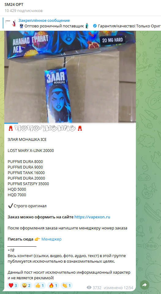 Несмотря на то, что телеграм-канал и сайт Vapexon Ru выглядят аккуратно и профессионально, при детальном разборе всплывает сразу несколько признаков, указывающих на серьезные риски для покупателей: