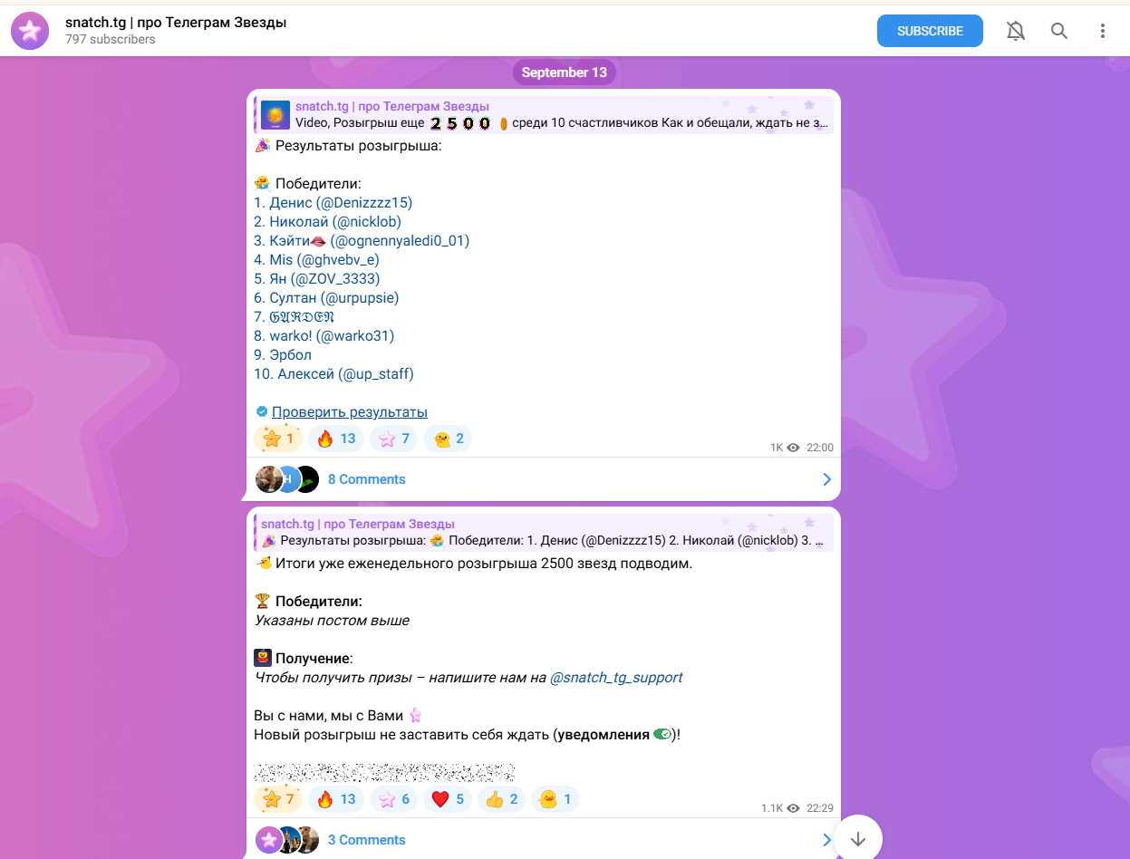 У проекта есть телеграм-канал «Snatch.Tg Про Телеграм Звезды». Здесь немного подписчиков – всего 797 человек. Активность в нем появилась в сентябре 2025 года. Сервис использует канал для проведения розыгрышей. Регулярно здесь объявляются конкурсы, в которых можно выиграть звезды.Условия сотрудничества