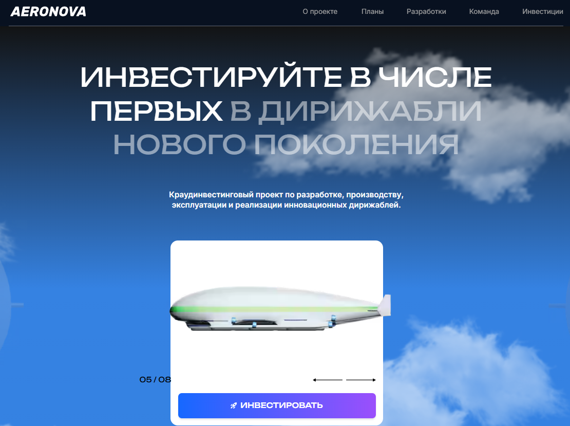 Официальный сайт https reg solargroup pro ru landings progress оформлен в светло-синих тонах. Главная страница рассказывает о дирижаблях Aeronova. Весь дизайн сделан на конструкторе Tilda.