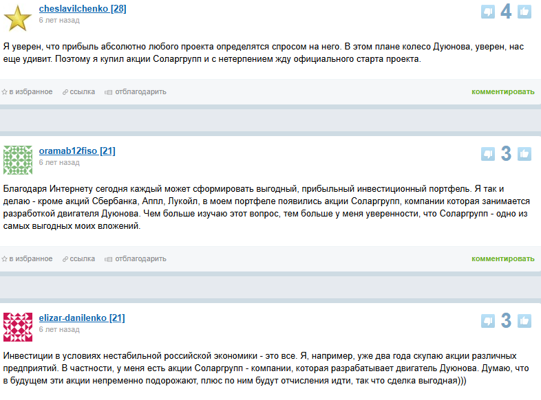 В интернете крайне мало независимых отзывов о «Солар групп». Положительные комментарии оставлены новыми аккаунтами на форумах. Пользователи без истории активности пишут о выгодных вложениях в акции. Хвалят разработку двигателя Дуюнова. Такая картина указывает на накрутку.