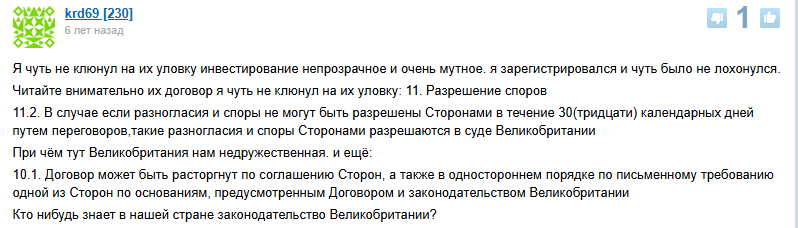 Участник одного форума рассказал о непрозрачной схеме. Он зарегистрировался, но после чтения договора отказался вкладывать деньги. Больше всего насторожили пункты о британских судах Solar group ltd и применении иностранного законодательства.