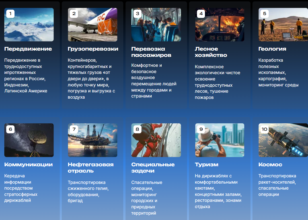 Сферы применения – передвижение в труднодоступных местах России, Индонезии, Латинской Америки. Грузоперевозки контейнеров и крупногабаритных грузов. Пассажирские рейсы между городами. Лесное хозяйство и тушение пожаров. Нефтегазовая отрасль. Геология и разведка. Коммуникации через стратосферные дирижабли. Спецзадачи и мониторинг территорий.