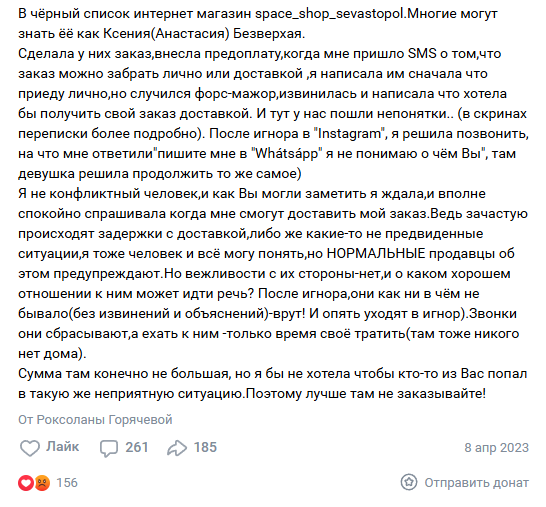 Обзор интернет-магазина Space Shop Sevastopol: анализ деятельности и отзывов о Безверхой Анастасии