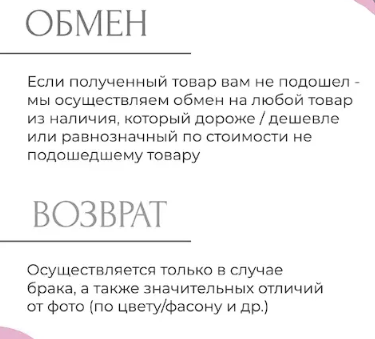 Магазин предлагает обмен товара при несоответствии. Возможна замена на другую вещь из наличия. Главное условие – равнозначность или меньшая стоимость по сравнению с оплаченным изделием. Возврат денег происходит только при браке. Также учитываются значительные отличия от фото по цвету или фасону. В остальных ситуациях средства не возвращают.