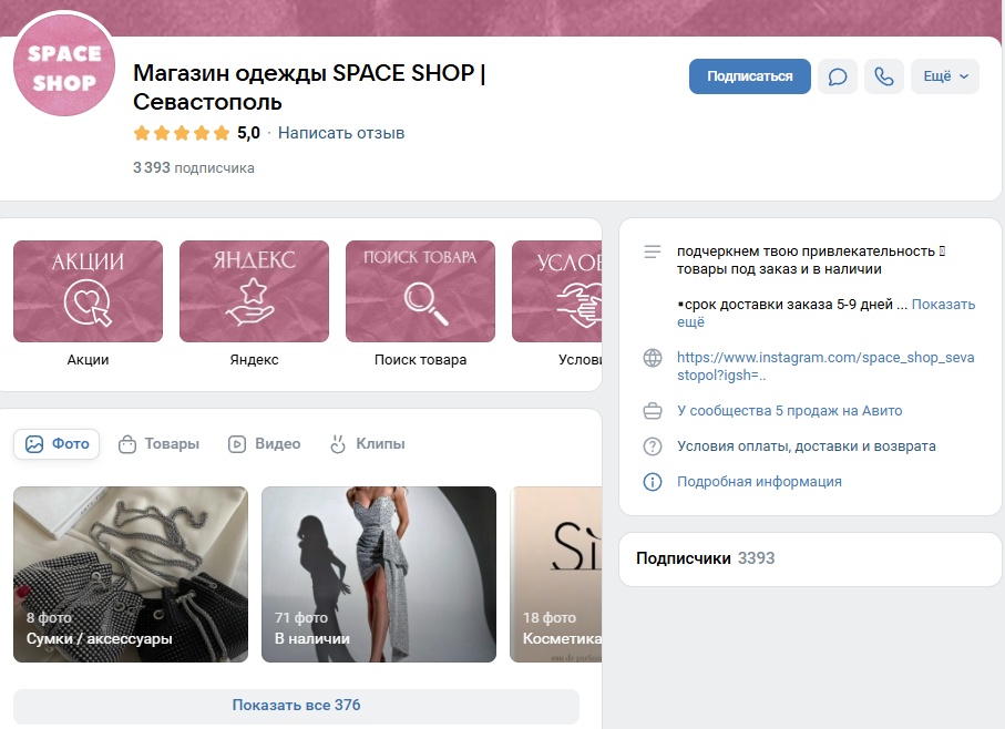 Инстаграм показывает 8800 подписчиков. Основная активность сосредоточена именно там. Магазин публикует фото товаров, описание условий работы.