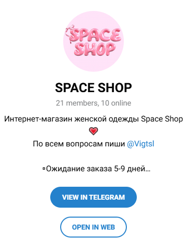 Телеграм Space Shop имеет всего 21 подписчика. Канал практически не развит. Контент в мессенджере сводится к базовой информации о заказах.