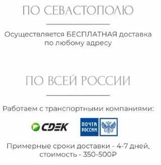 По Севастополю доставка бесплатная. Заказ привозят по указанному адресу без дополнительных трат. Для других регионов России работают транспортные компании. Магазин сотрудничает со СДЭК, Почтой России. Сроки отправки составляют 4–7 дней. Стоимость пересылки варьируется от 350 до 500 рублей.