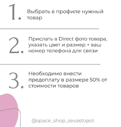 Процесс оформления включает три этапа. Клиент выбирает товар в профиле. Затем отправляет фото изделия менеджеру в Тг Space Shop с указанием цвета, размера и телефона. Последний шаг – внесение предоплаты 50% от стоимости.