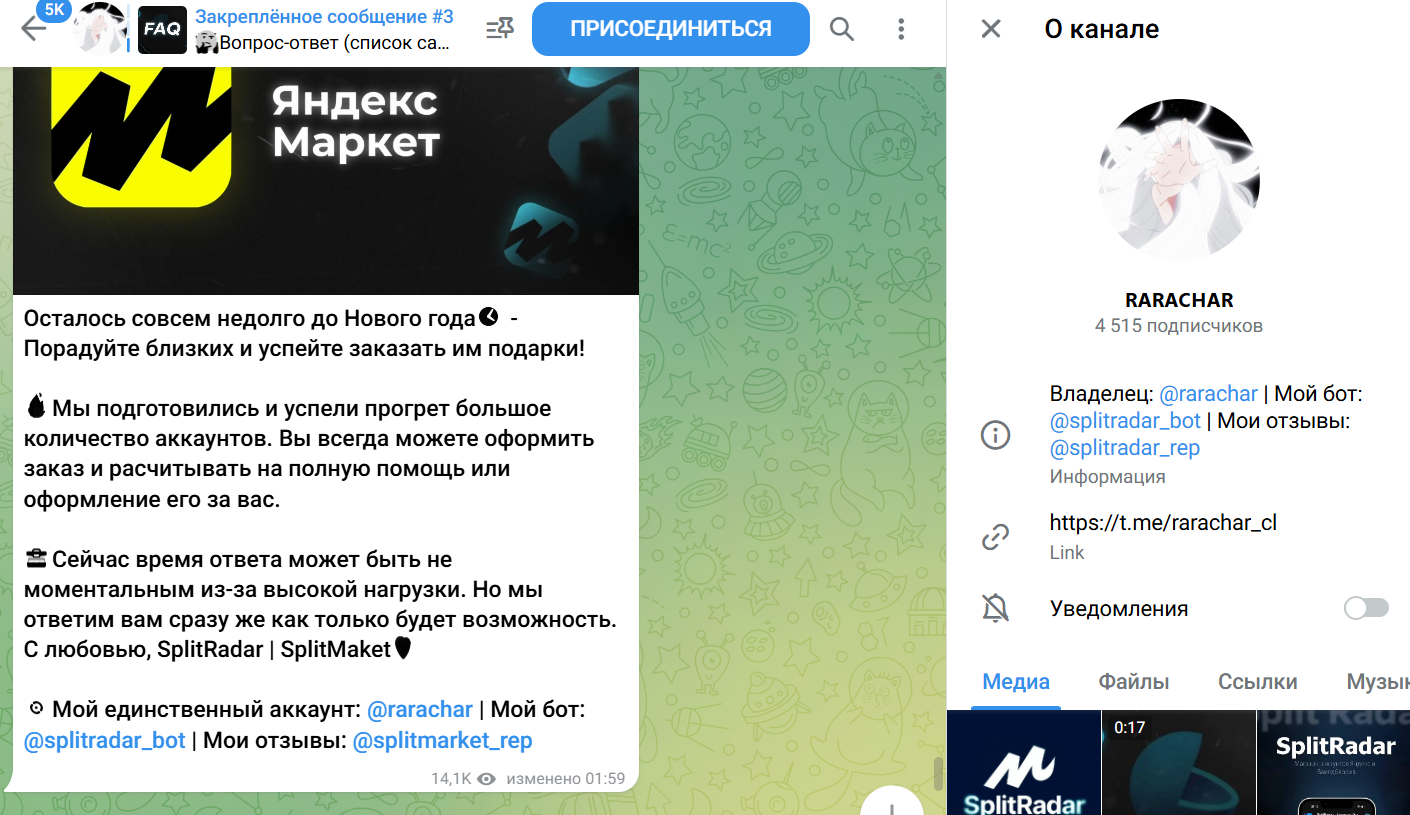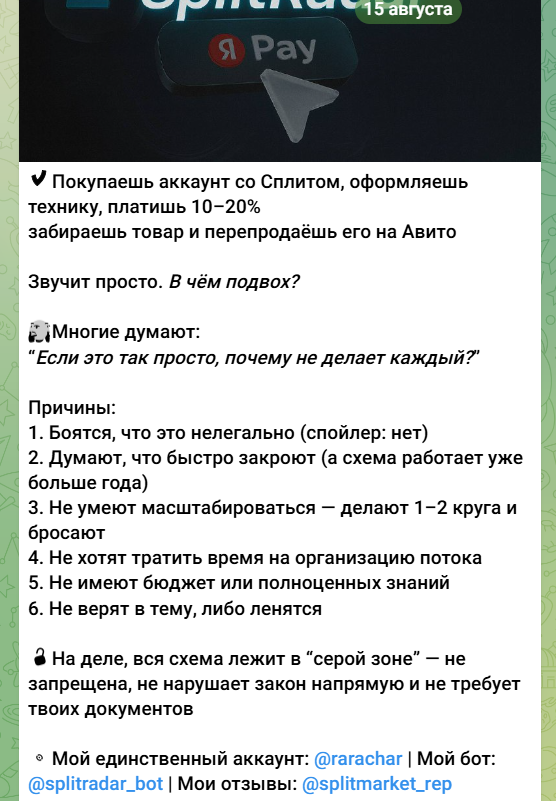 О Split market в Телеграмм отзывы отсутствуют. Анонимный владелец канала, который представляется под псевдонимом Rarachar, продает аккаунты с активированной рассрочкой от Яндекс сплит и Wildberries. Также у создателя сообщества есть ферма для прогрева аккаунтов. Больше деталей о его деятельности расскажем далее в статье.