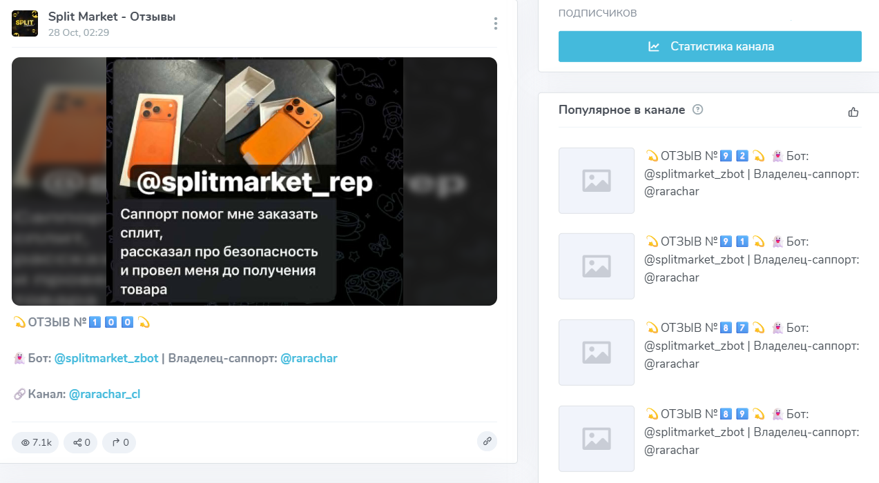- отсутствие реальных отзывов об услугах в Телеграм канале Сплит маркет: