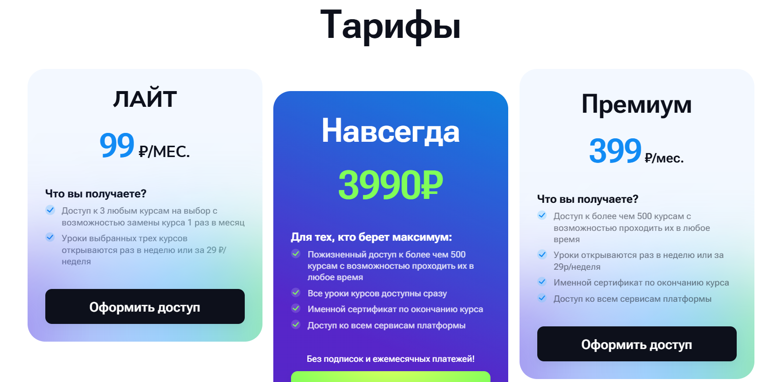 • “Лайт”. Можно получить доступ к 3 любым курсам, и открывать их можно 1 раз в неделю (далее платить 29 рублей). Стоит подписка 99 рублей в месяц;