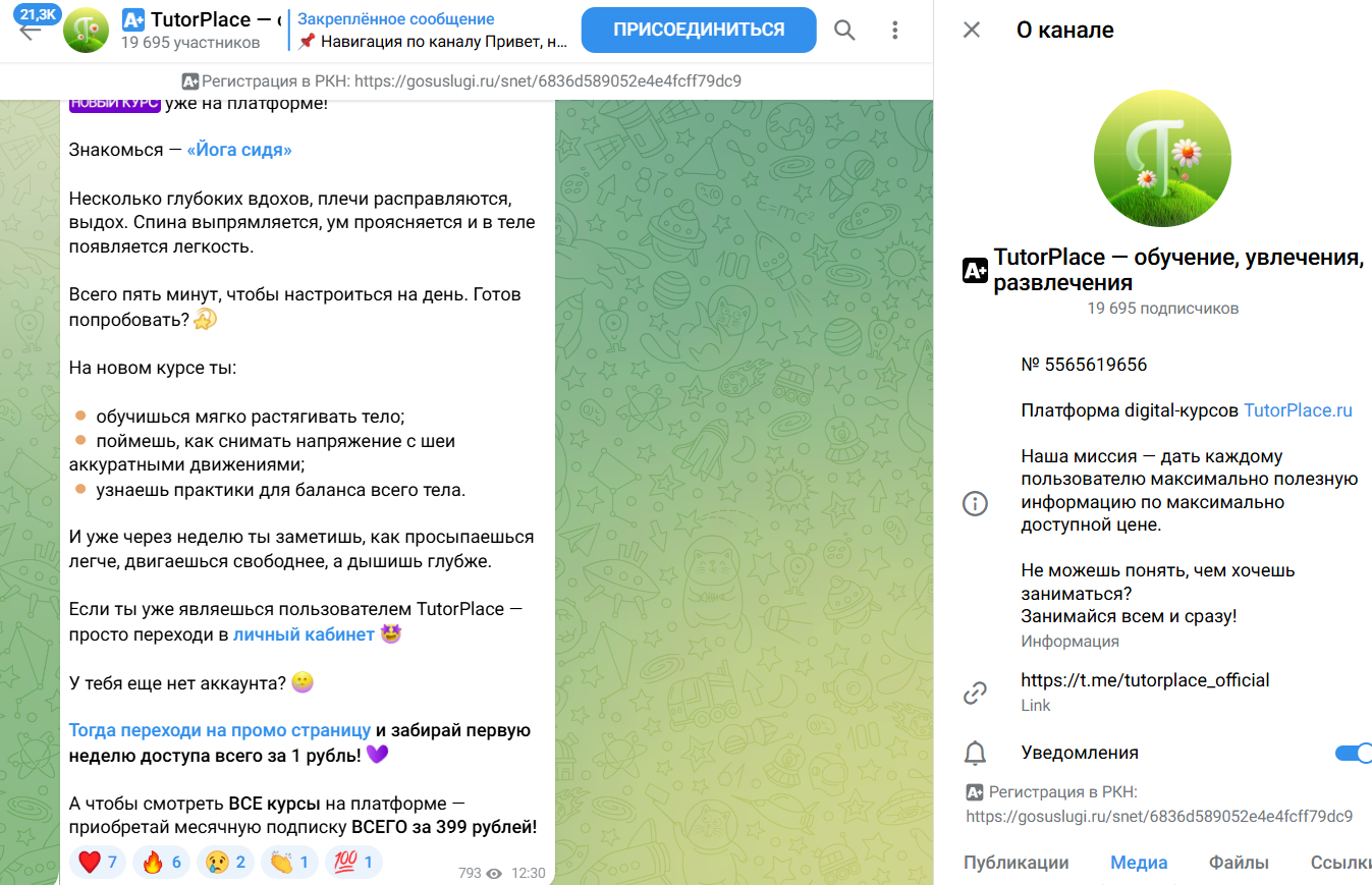 У проекта есть Telegram канал TutorPlace обучение увлечения развлечения, созданный в 2023 году. Сейчас у него 19.6 тыс. пользователей, которые активно читают посты.