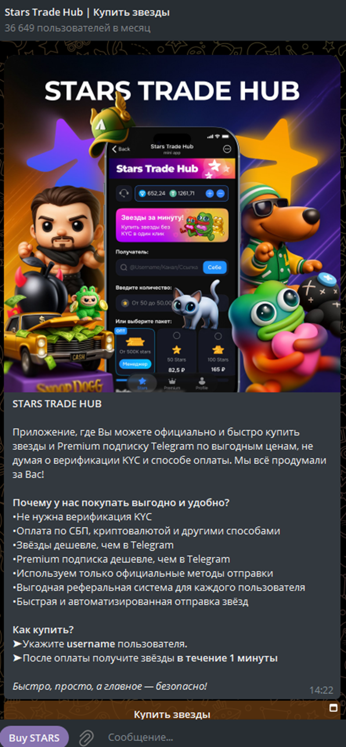 Stars Trade Hub – Телеграмм бот, при помощи которого можно быстро и по доступным ценам купить подписку Премиум и звезды. Пользователям обещают выгодные курсы, отсутствие сложной верификации KYC. Заявлено, что приобретенные активы моментально отправляются на аккаунт. Но реальных отзывов о работе этого мини-приложения нет. Неизвестно, является ли проект скамом или тут действительно можно купить цифровые активы.