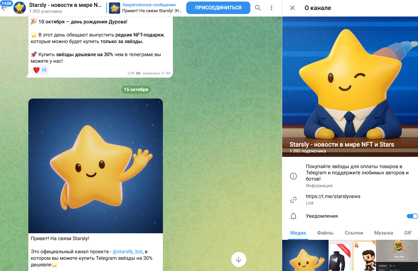 В ленте сообщества можно ознакомиться с принципом работы Starslyy bot, его привилегиями. Админы часто информируют о новостях из мира тг-гифтов, рассказывают о новых NFT-подарках, а также улучшениях старых. Пользователи могут узнать, за какую стоимость была продана определенная коллекция подарков, а ещё ознакомиться со статистикой продаж.