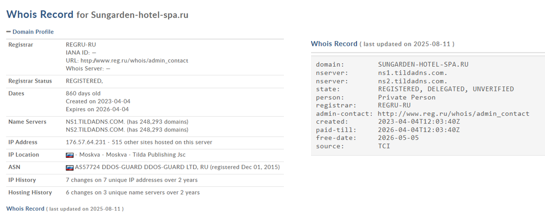 Кроме прочего, стоит обратить внимание на технические детали домена sungarden hotel spa ru. Согласно Whois-записи, он зарегистрирован 4 апреля 2023 г. и оформлен через REGRU-RU, но в разделе администратора указан Private Person, т.е. данные владельца скрыты, что не внушает доверия к такому крупному инвестиционному проекту.