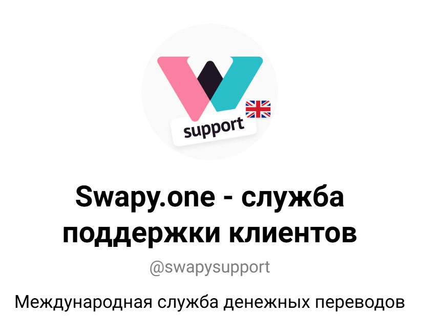 В описании ТГ-канала приводится ссылка для связи с представителями поддержки по ссылке swapysupport. Сам профиль называется Swapy.one — служба поддержки клиентов. Сюда предлагают обращаться при появлении каких-либо сложностей с проведением транзакций.