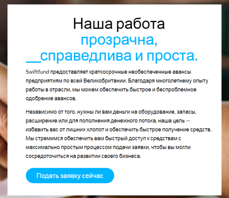 В одном из них указывается, что проект работает прозрачно, справедливо и просто. В его рамках предоставляются краткосрочные необеспеченные авансы предприятиями по всей Великобритании. Якобы благодаря многолетнему стажу фирма обслуживает своих клиентов быстро и без проблем одобряет заявки.