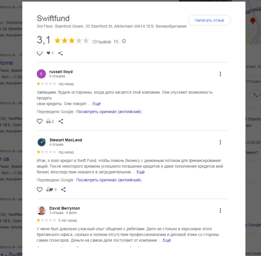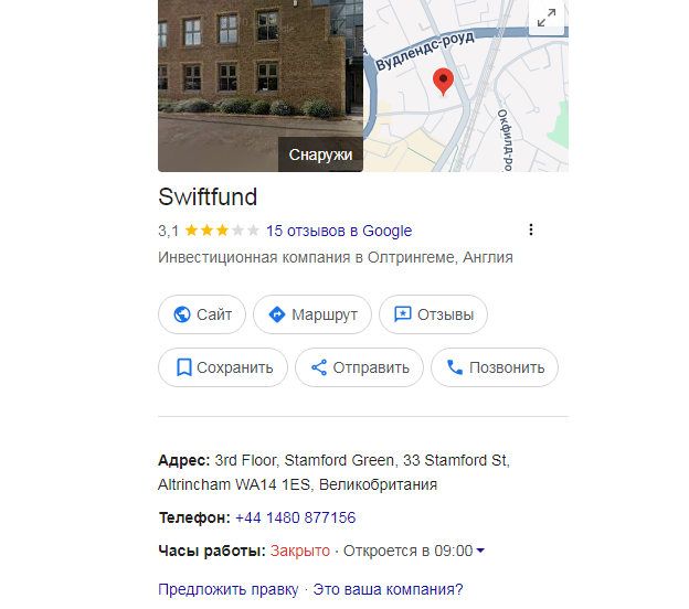Точный возраст организации у нас определить не получилось. В интернете она нигде не упоминается, что показывает отсутствие у нее известности и востребованности. На GoogleMaps мы увидели, что организация Swiftfund Investment действительно находится по заявленному адресу, и тут в ее сторону оставлено 15 отзывов, большинство из которых содержат негатив.