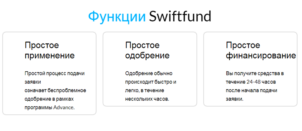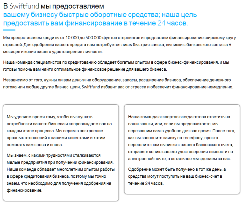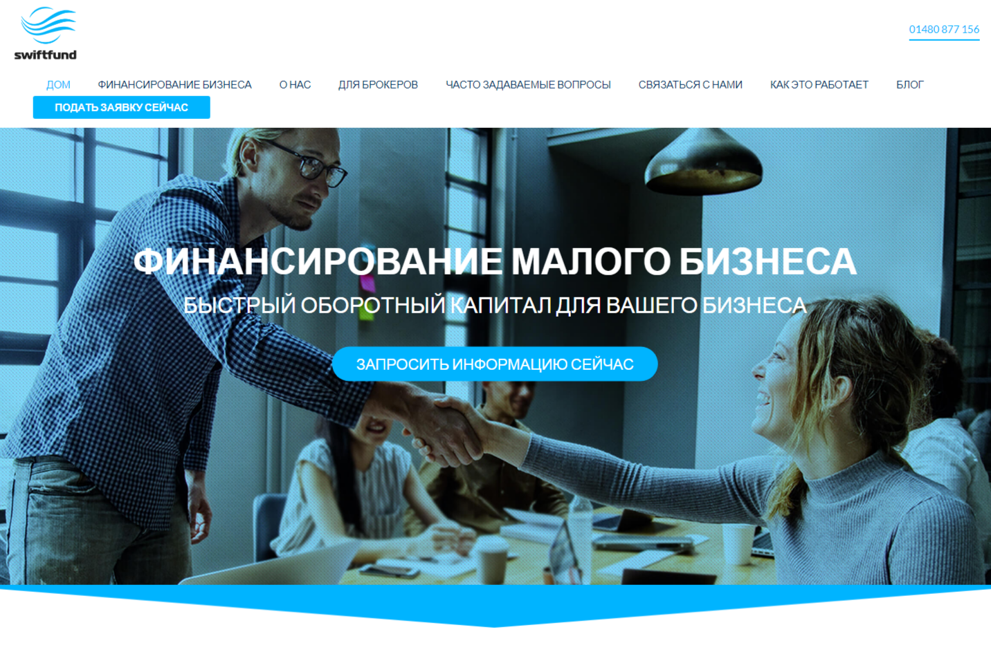 Организация Swiftfund Co Uk оказывает только одну услугу: финансирование предприятий. Стать их клиентом может компания из любой сферы: общепит, строительство, здравоохранение и так далее. Для них выделяют от 10 000 до 500 000 фунтов. Все процессы занимают не больше 24 часов. Авторы нацелены на то, чтобы предприниматели получили деньги как можно скорее.