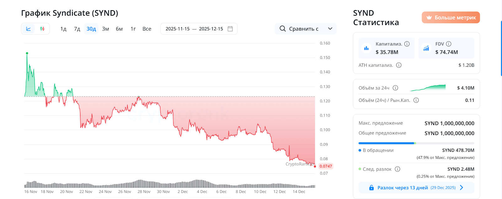 Судя по динамике, стоимость SYND длительное время находится в нисходящем тренде. Резкого роста не наблюдается, а падение цены совпадает с низкой активностью проекта и отсутствием значимых новостей от команды разработчиков.