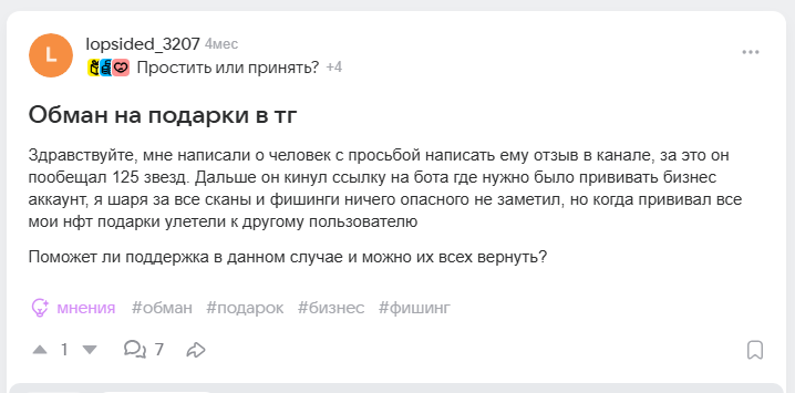 В интернете люди негативно отзываются о ТГ «подарки ТГ Телеграм» и связанном с ним боте. В одном из комментариев пострадавший рассказал, что для участия в «задании» его попросили привязать личный аккаунт в Telegram. После этого он лишился всех имеющихся подарков, которые покупал и получал ранее.