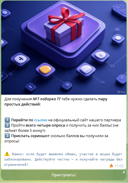 В чем опасность использования бота «NFT подарки Telegram»