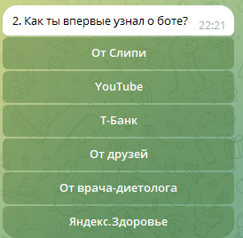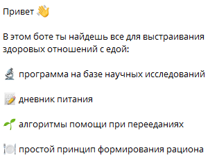 С помощью телеграм-программы якобы можно эффективно регулировать свою пищевую стратегию и избежать перееданий. Умный робот отслеживает время приема пищи, рацион пользователя и дает рекомендации по улучшению food поведения. Пользователю необходимо честно заносить информацию в Telegram сервис обработки данных Teya. При запуске системы контроля людям нужно указать сведения о том, откуда стало известно о фуд приложении.