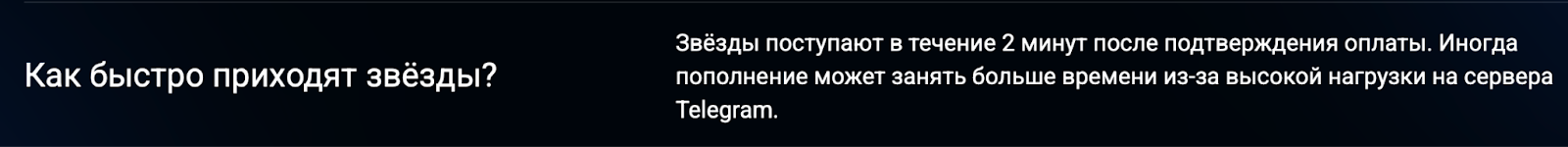 Для совершения покупки достаточно выполнить несколько простых действий: указать юзернейм телеграм в заявке, выбрать услугу и оплатить ее. На сайте сказано, что купленные звезды начисляются в «считанные минуты», однако в разделе Q&A есть уточнение: процесс может растянуться на двое суток. На наш взгляд, разница между «несколькими минутами» и «до 48 часов» внушительна. В других разделах сайта формулировка еще более размытая: якобы времени на обработку заявки может уйти больше из-за «нагрузок на сервер».
