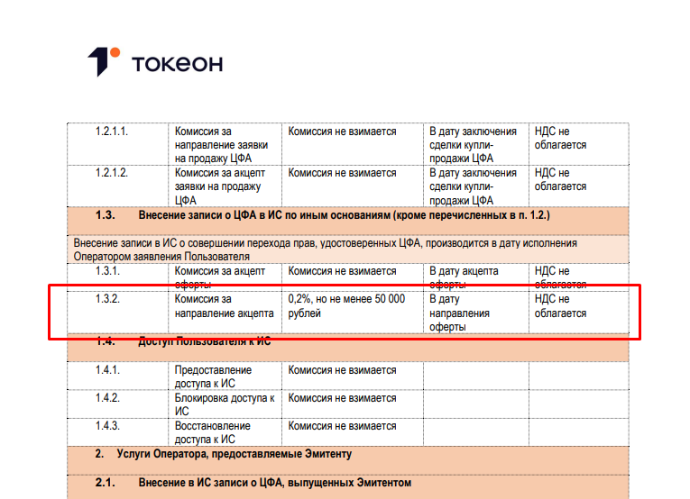 Фактически команда пытается сделать использование токенов максимально дешевым, но в некоторых случаях они собирают комиссию 0.2% (минимум 50 000 рублей) за принятие оферты. Также, так как компании Tokeon ru необходимо получать доход, услуги типа: разработка уникального смарт-контракта, повторный выпуск, юридическая помощь и подключение дополнительных сервисов являются платными. Их цена открыто не выкладывается, потому что условия зависят от конкретного объема работы / эмитента. При этом для инвесторов это не играет никакой роли — покупка / продажа ЦФА имеют нулевую комиссию.
