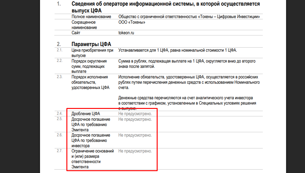 При создании ЦФА через оператора Токеон важно учитывать, что они не подлежат дроблению, а это снижает гибкость инвестирования. Также нет возможности досрочного погашения, вы не сможете потребовать выполнения обязательств быстрее заявленных сроков. Компания Tokeon никак не влияет не финансовые возможности актива, не исключает вероятность дефолта, поэтому есть риски при вложениях.