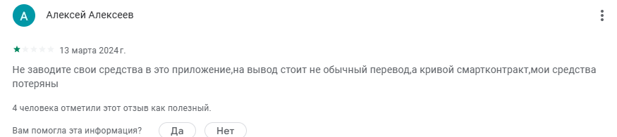 Негативные отзывы реально пугают. Люди массово пишут про полную потерю средств при попытке вывода денег. По их словам, вместо обычного нормального перевода почему-то используется какой-то нестандартный смарт-контракт, после чего деньги просто бесследно исчезают в никуда.
