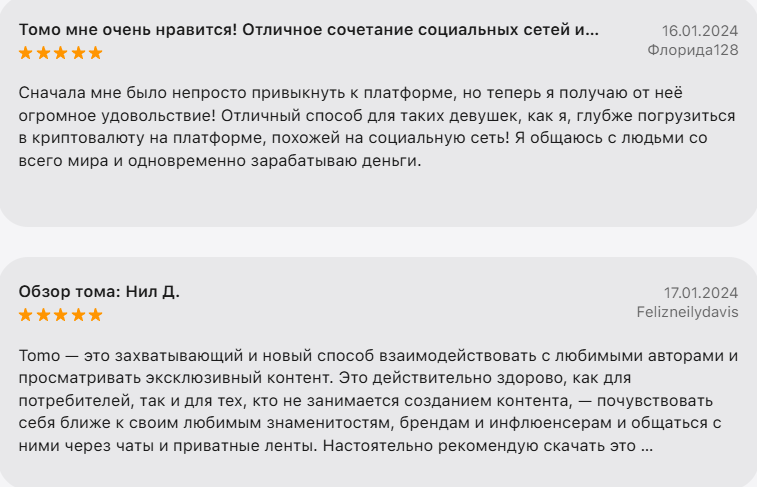 Положительные отзывы тоже иногда встречаются, но значительно реже негативных. Людям в целом нравится сама идея совместить криптофункции с социальными возможностями в одном приложении. Хвалят удобство общения с единомышленниками.