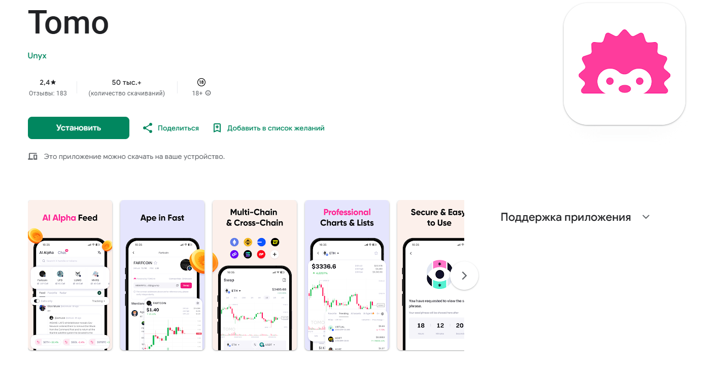 Оценки на разных платформах отличаются просто кардинально. В Google Play общий рейтинг 2.4 балла при 50 тысячах скачиваний. В App Store картина совершенно другая – там уже 4.3 балла. А расширение для Chrome и вовсе умудрилось получить оценку 4.7. Такой огромный разброс в отзывах о Tomo Wallet выглядит подозрительно.