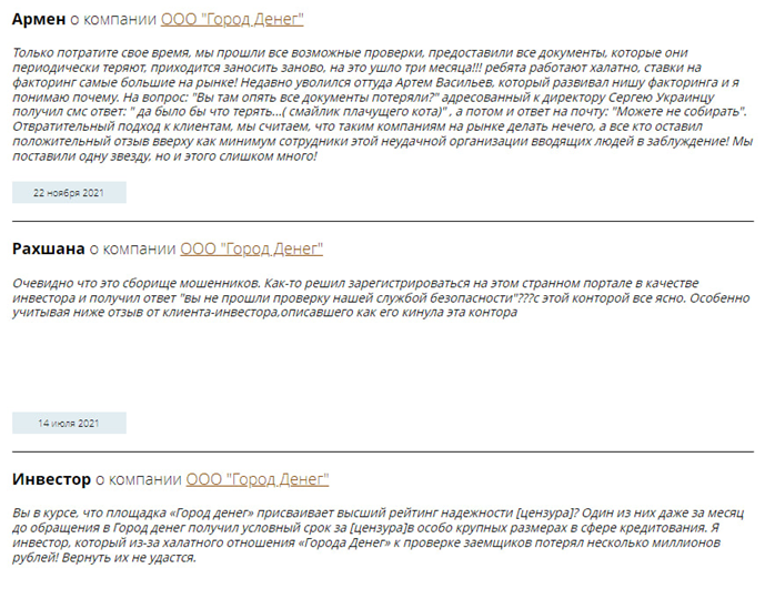 Отзывы об инвестиционной платформе «Город Денег» разные, но большая часть негативные. В них пользователи утверждают, что в этой компании можно только бессмысленно потратить время и деньги. Утверждается, что сервис часто теряет предоставленные документы. Инвесторов возмущает тот факт, что ставки на факторинг самые большие на рынке. Проект показывает ужасный подход к клиентам. В положительных отзывах указывается, что сотрудники высший класс. Все якобы просто и легко. Скорее всего, эти комментарии куплены.
