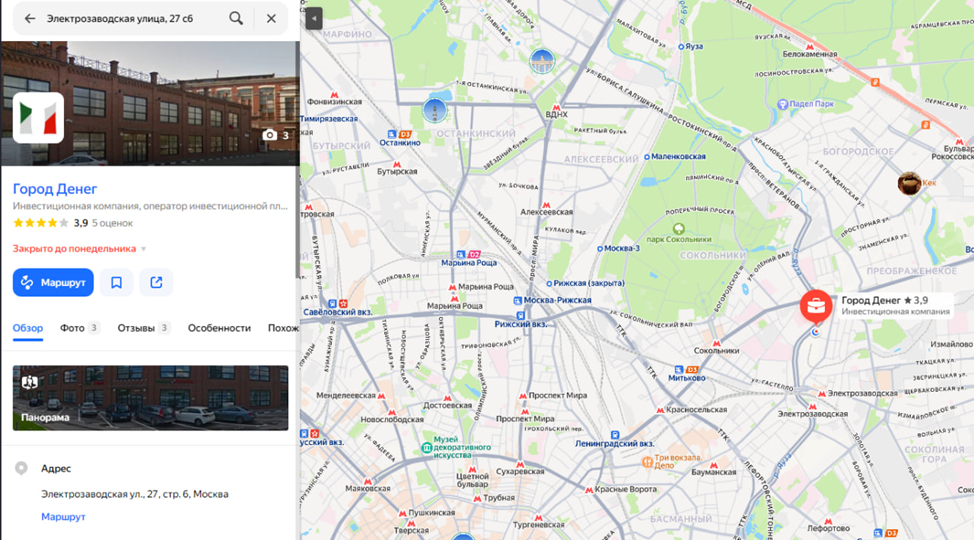 Кроме почты, краудфандинговая платформа «Город Денег» указывает номер телефона (8 800 333-54-11). Это контакт, который зарегистрирован в России. Статус является доступным. То есть, номер находиться в сети. На него можно попробовать дозвониться. Но и там может быть постоянно занято. Или будет отвечать автоответчик. Также на сайте указан юридический адрес офиса: Электрозаводская улица, 27 с6. Проверка карт показала, что он реален. Имеются фотографии офиса и даже отзывы разного типа. Можно построить маршрут и посмотреть, как работает компания.