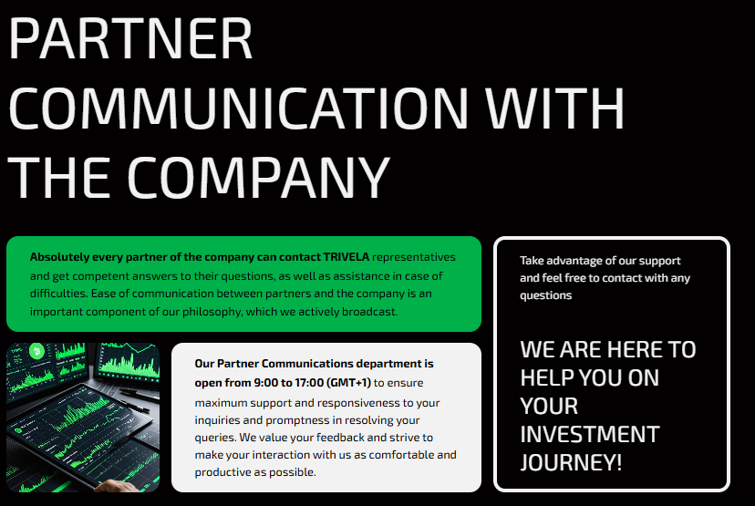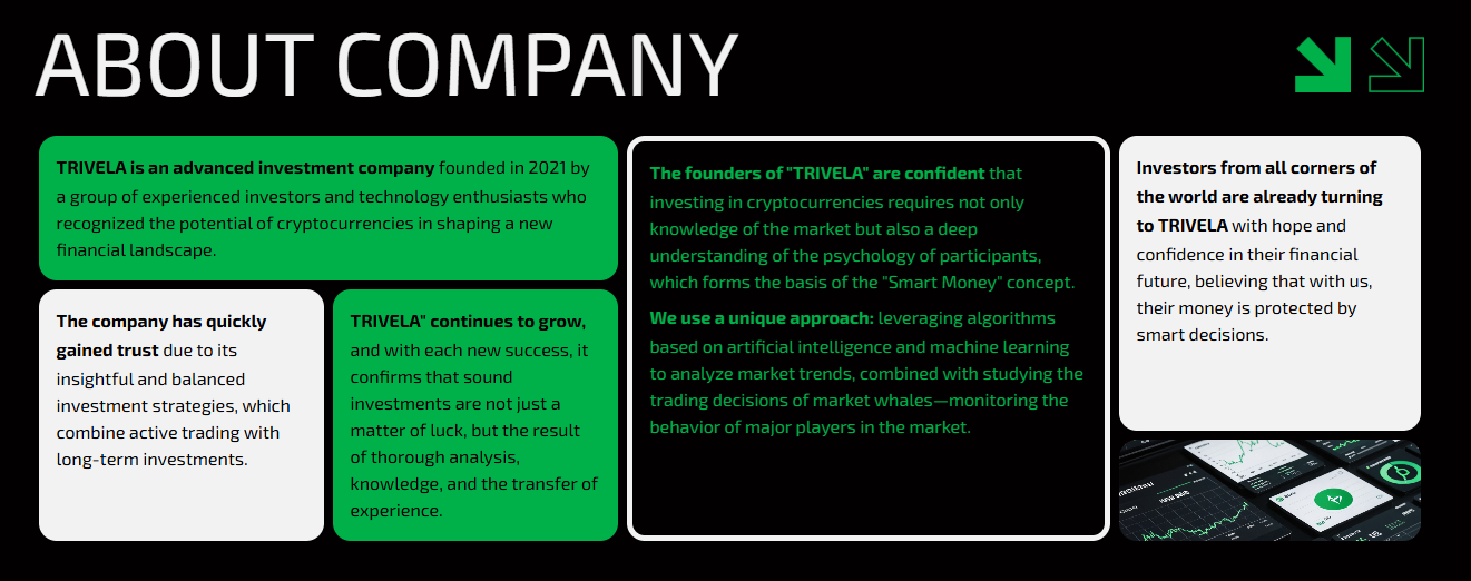 Вот так пишут о себе основатели компании Trivela. Организация верит в инвестиции, работает с разными форматами, а инвесторы могут быть уверены в своем финансовом будущем.