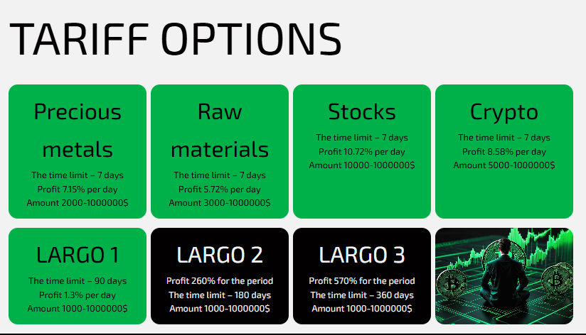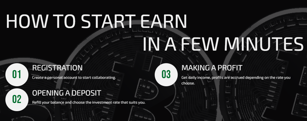 Чтобы начать зарабатывать на платформе, необходимо зарегистрироваться, выбрать депозит и пополнить счет. Никаких дополнительных операций не нужно. Пополнение только в криптовалюте.Если не смотреть на Нео в медитации перед Биткоинами, то можно найти интересные тарифы. Минимальная доходность — от 1.3% в сутки по тарифу LARGO 1. Минимальный депозит — $1000 на 90 дней.