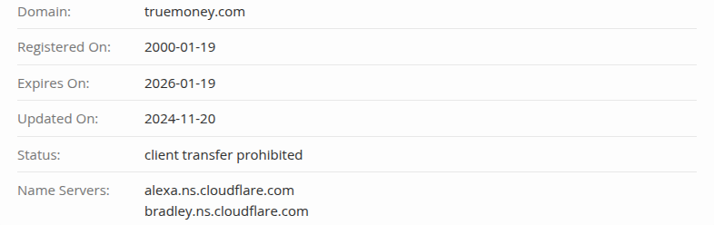 На сайте проекта TrueMoney com мы заметили приписку, что платформа работает с 2015 года. Утверждение решили проверить через аналитический сервис WHOIS. Проверка показала, что сам адрес существует давно — с 19.01.2000 года, но вот последнее изменение было 20.11.2024 года. Мы не исключаем, что как раз в это время команда «накатила» проект True Money Wallet Thailand на старый адрес.