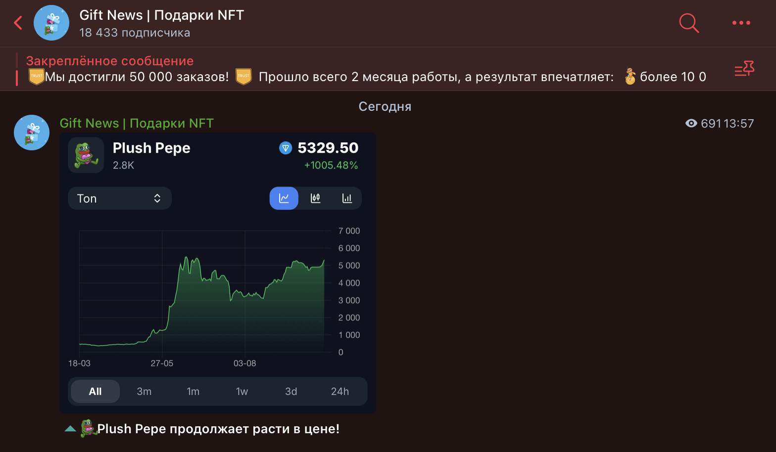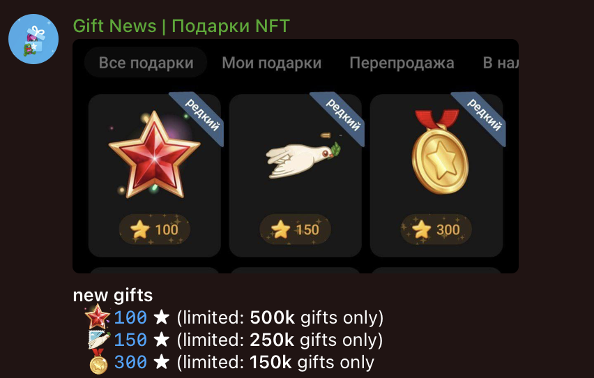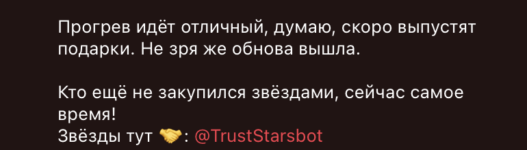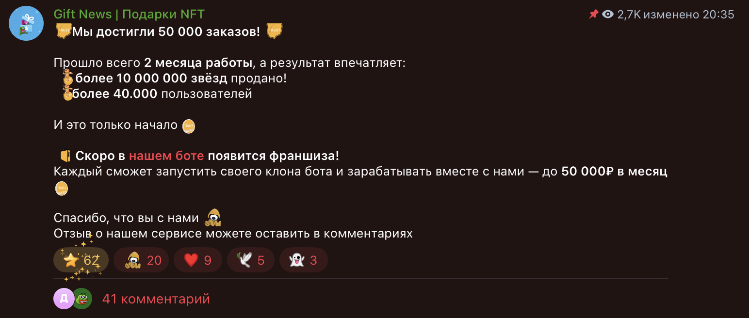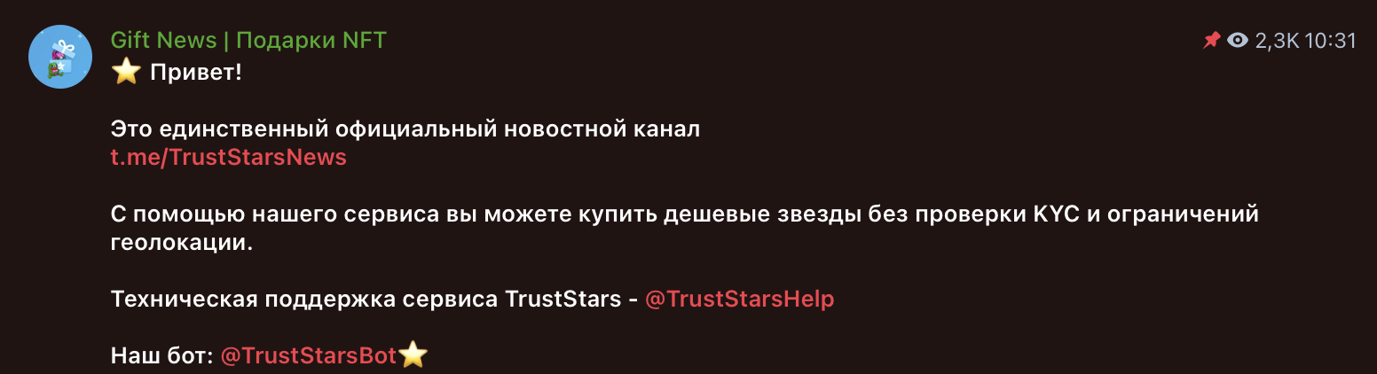 Trust Stars полностью построил свою экосистему в Telegram, создав полноценный набор инструментов для привлечения аудитории. В данную экосистему входит новостной канал Gift news Подарки NFT под ником TrustStarsNews, где постоянно публикуются «доказательства» финансового успеха в виде скринов крупных переводов и восторженных отзывов.
